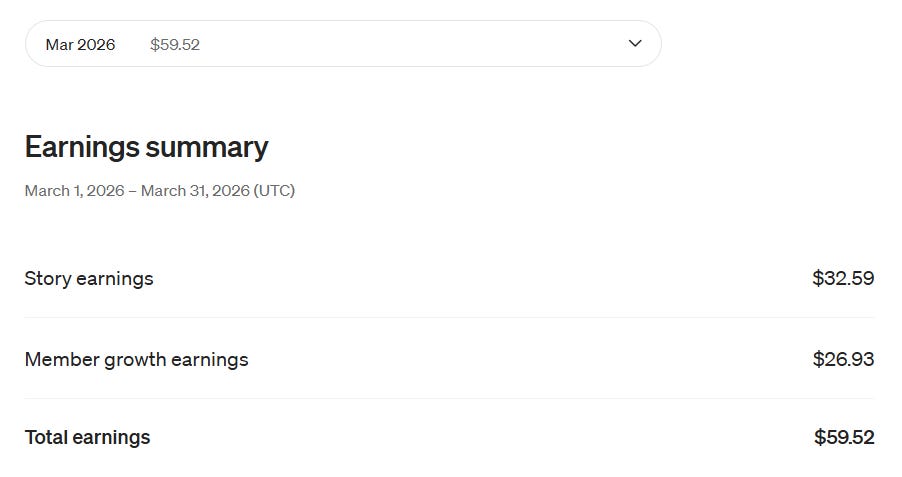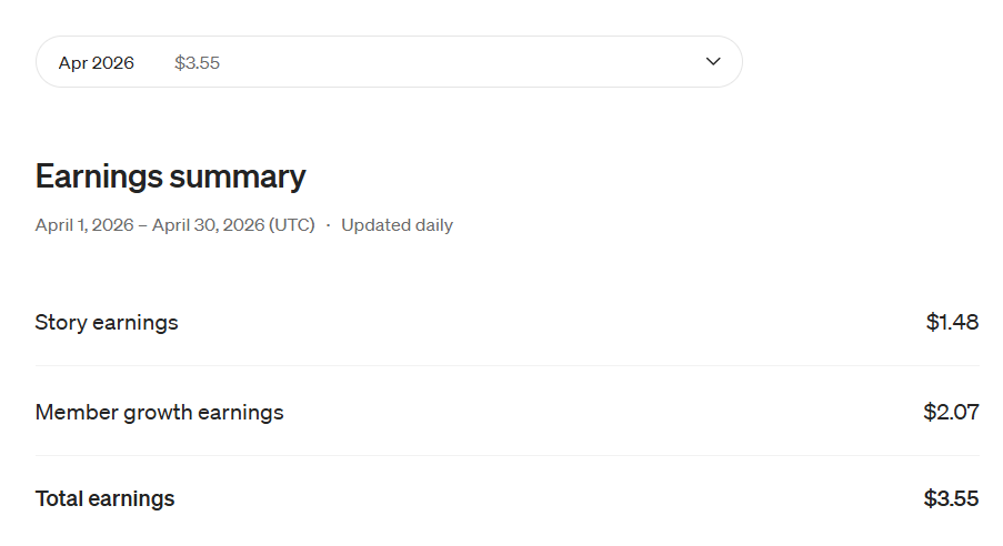 For April, Member growth earnings have increased or decreased. I can’t tell because there is no way to know how many people have signed up for a Medium membership through my stories…